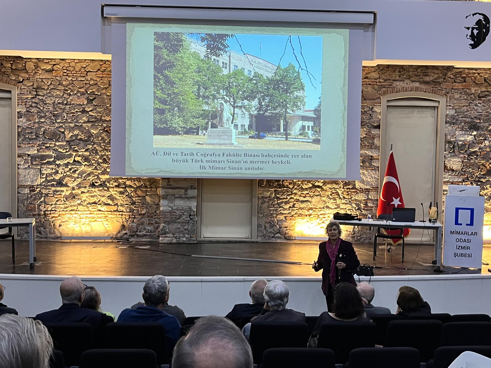 Mimar Sinan Haftası etkinlikleri Prof. Dr. R. Eser Gültekin’in Mimar Sinan’ın hayatını ve eserlerini anlattığı sunumuyla devam etti. Günün en özel anlarından biri ise, Prof. Dr. R. Eser Gültekin Hocamızın Mimarlar Odası İzmir Şubesi’ne anlamlı bir armağanı olan, heykel ve seramik sanatçısı Behçet Aktaş imzalı Mimar Sinan Maskı’nın açılışıydı.